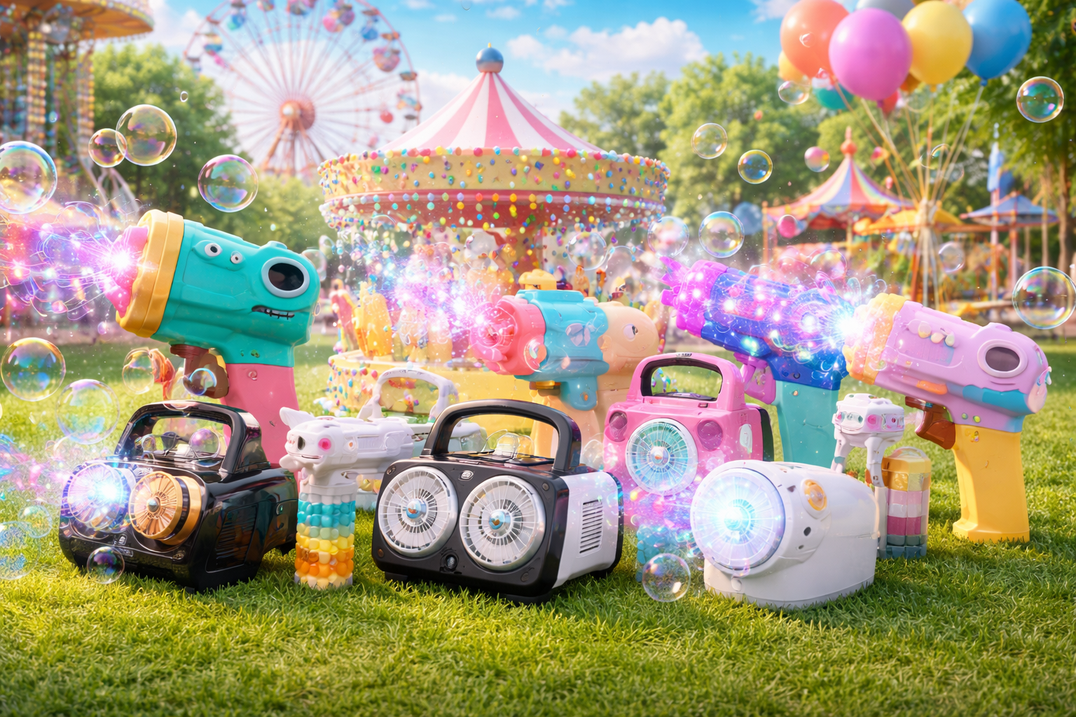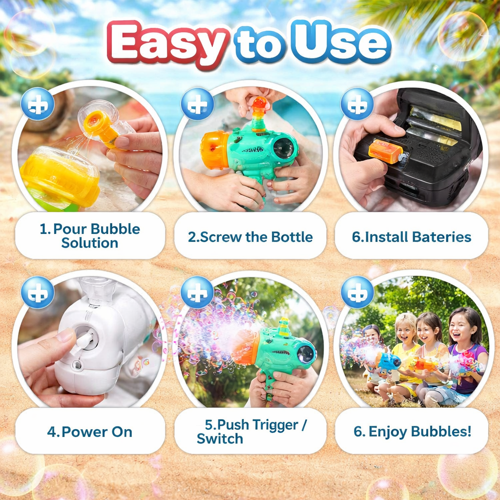 Turn on the machine, press the trigger, and enjoy magical bubbles!